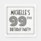 This elegant and Roaring Twenties inspired ninety-ninth birthday celebration paper napkin design features a personalised name, a fancy art deco style inspired number “99th”, the message “BIRTHDAY PARTY!”, and a border pattern consisting of lines. Paper napkins like these might be used when celebrating somebody’s ninety ninth birthday. [~Z0000613]