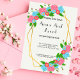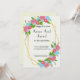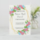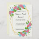 Design: Off-white invitation with a gold geometric frame and pink and blue flowers