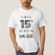 This 15th birthday party shirt design features the message "HAPPY 15th BIRTHDAY,", along with a personalized name. The text and digits have an art deco inspired look, reminiscent of the 1920s or 1930s. Shirts like this might be worn by the guests at a party being held to celebrate the birthday of somebody who is turning 15 years old. [~Z0000451]
