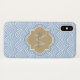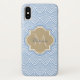 A stylish light blue art deco fish scale pattern Barely There iPhone X Case with a tan quatrefoil badge you can personalise by easily adding your monogram and name. This is part of the Little Boy Blue Fishcale Warm Sand Monogram Spring Collection.