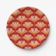 Paper party plates in a reproduction of a stylised, Art Deco lily, wallpaper pattern - a gradient of deep flame orange to white, accented with mustard gold, on a deep tangerine orange background