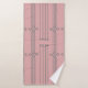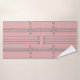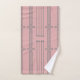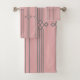This towel set has an art deco design of vertical lines with diamonds and circles in silver on a field of pink.
