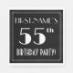 This stylish fifty-fifth birthday celebration paper napkin design features an editable name, a fancy art deco look inspired number “55th”, the message “BIRTHDAY PARTY!”, and a multi-line border. There is a black-coloured background by default, but it can be customised to a different colour, if desired. Paper napkins like these might be used at a birthday party for somebody who is celebrating their 55th birthday. [~Z0000612]