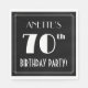 This Roaring Twenties inspired seventieth birthday party paper napkin design features a personalised name, an intricate art deco look inspired number “70th”, the message “BIRTHDAY PARTY!”, and a multi-line border. There is a black-coloured background by default, but it can be customised to a different colour, if desired. Stylish birthday themed paper napkins like these might be used at a party celebrating somebody’s seventieth birthday. [~Z0000612]