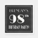 This stylish and Roaring Twenties inspired ninety-eighth birthday party paper napkin design features an editable name, a fancy art deco look inspired number “98th”, the message “BIRTHDAY PARTY!”, and a multi-line border. The background is coloured black by default, but it can be customised to a different colour, if desired. Stylish birthday themed paper napkins like these might be used at a party in celebration of somebody’s ninety eighth birthday. [~Z0000612]