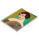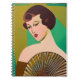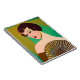 Notebook in a modern, semi-abstract, Art Deco inspired portrait of a demure lady, holding a fan, against a jade green and gold coloured background