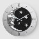 Classic Art Deco moon and stars design clock in brushed metallic silver, with a black onyx / black enamel look background