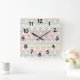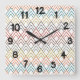 This wall clock has an art deco design of upside down Vs in retro colors of orange, teal, gold, black, red, brown, and gray.