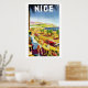 A Paris Lyon Marseille (PLM) 1920s-1930s vintage art deco travel advertisement, promoting the good life in Nice on the French Riviera: palm trees, beautiful woman, wonderful classic cars, the sea, the mountains. (The Alps)