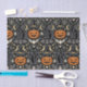 A dramatic Art Deco–inspired Halloween repeating pattern set against a deep black background, featuring sleek, stylised black cats with glowing green eyes arranged in a bold, symmetrical rhythm. Classic Halloween motifs—jack-o’-lanterns, crescent moons, bats, spiders, spiderwebs, witches’ hats, and sparkling geometric stars—are rendered in refined Deco forms with clean lines and elegant contrast. A limited palette of inky black, warm pumpkin orange, champagne gold, and soft ivory creates a glamourous, nocturnal mood that feels luxurious and sophisticated rather than playful.