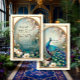 A beautiful aged and antiqued golden dimensional Art Deco frame surrounds the front image of a beautiful misty flower garden with water running through it and on the reverse side there is an image of a regal peacock standing on a branch surrounded by trees. White Magnolia flowers and pale blush pink pastel blossoms sparkle against a misty ethereal sky. Graphically designed by internationally licensed artist and designer, Audrey Jeanne Roberts ©