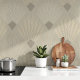 Revamp your living space with this stylish Art Deco Peel & Stick wallpaper, featuring an elegant geometric design. The pattern showcases a sophisticated palette of beige, taupe, cream, and soft grey, forming striking fan and diamond shapes that epitomise the classic Art Deco style. Perfect for creating a feature wall or enhancing the decor of any room, this wallpaper brings a touch of glamour and modernity to your home. Made from premium, repositionable material, it is easy to apply and remove, ensuring a seamless and stress-free installation.