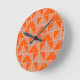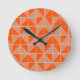 This clock has an art deco design of squares divided in half by diagonal lines of silver. The squares are then pieced together on a field of orange.