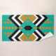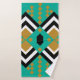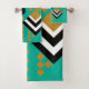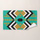 This towel set has an art deco quilt-inspired design of diamond shapes in black, white, and gold on a field of turquoise.