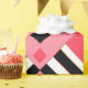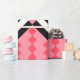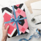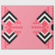 This wrapping paper has an art deco quilt-inspired design of diamond shapes in black, white, and pink on a field of watermelon.
