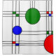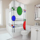 This shower curtain has an art deco stained-glass window design of black lines and red, blue, and green squares and circles.