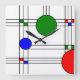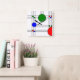 This wall clock has an art deco stained-glass window design of black lines and red, blue, and green squares and circles.