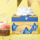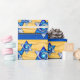 Gorgeous glossy gift wrapping paper features Jewbilee's original digital painting of an Art Deco inspired stained glass Star of David in varying shades of royal blue floating above a 3 layered background of deep yellow waves, silver on black greek key, and royal blue horizontal stripes.