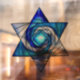 Decorate your windows and/or doors at the holidays or all year 'round with this gorgeous Art Deco style Magen David (Star of David) which has the look of stained glass in brilliant shades of royal blue and white. Original design by Leslie Sigal Javorek.