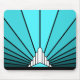 An iconic pattern of the sun rising from behind a stylized art deco shaped building. A simple yet elegant design, true to the era.