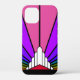 An iconic pattern of the sun rising from behind a stylized art deco shaped building. A simple yet elegant design, true to the era.