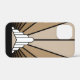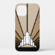 An iconic pattern of the sun rising from behind a stylized art deco shaped building. A simple yet elegant design, true to the era.
