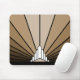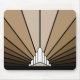 An iconic pattern of the sun rising from behind a stylized art deco shaped building. A simple yet elegant design, true to the era.
