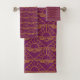 This towel set has an art deco design of semi-circles and lines that look like a sunrise in gold on a field of eggplant. Want different colours? Message me.