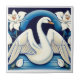 A white swan spreads its wings over art deco lilies on a beautiful blue background.