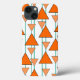 This phone case has an art deco design of triangles strung on teal lines in two shades of orange.