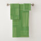 This towel set has an art deco design that looks like a weave in two shades of green on a field of green.