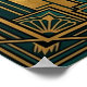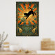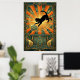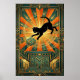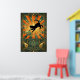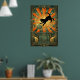 A mystical black cat silhouette spreads golden geometric wings above a teal marble pedestal, surrounded by orange radiating light rays. This luxurious mythical 1920s art deco design combines elegance and fantasy, creating a captivating statement piece for creative spaces, galleries and cat lovers who appreciate sophisticated, imaginative wall art.