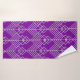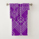 This towel set has an art deco design of diamond shapes and lines in silver on a field of purple.