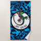This towel is decorated with a beautiful sparkling multicolor gecko silhouette in a circle. The background is a glitter wavy black and blue pattern reminding water.
