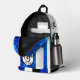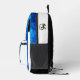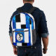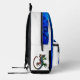 This backpack is decorated with a beautiful sparkling multicolor gecko silhouette in a circle and on the sides of backpack. The background is a geometric patchwork of glitter blue pattern, black and white.