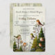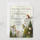 A delightful fantasy art illustration in a modern style depicts a bird family among various tall, light, medium, and dark green pine trees, with a creamy background and flowers.