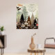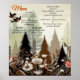 A delightful fantasy art illustration in a modern style depicts a bird family among various tall, light, medium, and dark green pine trees, with a creamy background and flowers.
