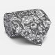 Tie in a William Morris design of stylised acanthus leaves and bachelors button blossoms, digitally enhanced and coloured in white outlined in black, on a graphite grey / grey background