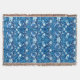 of stylised birds, flowers, strawberries, and leaves, digitally enhanced and coloured in shades of cobalt blue, light blue, and white, on a deep indigo blue background