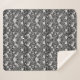 Sherpa Blanket in a vintage William Morris Art Nouveau tapestry pattern of stylised birds, flowers, strawberries, and leaves in shades of light silver grey / grey to dark charcoal grey, with white, on a black background