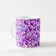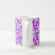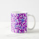 Coffee mug in a William Morris Art Nouveau tapestry pattern of exotic birds in a pomegranate tree, with amethyst purple and violet leaves, birds and fruit in turquoise, violet and cobalt blue, and a white background