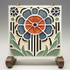 Embrace the timeless elegance of the Art Nouveau era with this exquisitely designed decorative ceramic tile. The design features a stunning, stylised central flower, capturing the organic, flowing lines characteristic of the period. The heart of the bloom glows with a vibrant, segmented orange-red, while graceful petals in a sophisticated dusty slate blue unfurl around it. The entire composition is brought to life through a beautiful tube-lining technique, where raised, creamy off-white lines define each element, creating a delightful tactile quality and a stained-glass effect. Flanked by soft sage green leaves and accented with intricate, wheel-like motifs, this tile is a balanced work of art. Perfect as a standout piece in a kitchen backsplash, a unique feature in a bathroom, or framed as a standalone art piece.