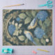 COORDINATING IMAGE 3B (REVERSED) OF 8. Inspired by art nouveau and craftsman era design with blue Hydrangea garden with a pair of love birds in colours of rich blue, pale yellow and pastel blue, muted sage green, black background and gold toned leaves and scrollwork. Softly enhanced by script handwriting ephemera that is layered softly over the crackle textured image.