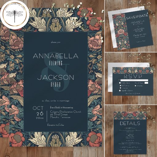 Indulge in the enchantment of the past with our vintage floral wedding invitations. Inspired by the iconic designs of William Morris, these invitations feature a mesmerising blend of teal blues, pinks, creams, and green. The intricate floral patterns, reminiscent of the Art Nouveau era, this design adds vintage allure to your special day. The dark blue text box, adorned with an elegant vintage font, provides a striking contrast against the vibrant floral backdrop. This timeless design captures the essence of classic romance, making it the perfect choice for couples seeking a truly unique and unforgettable invitation. Created by Simply Farmhouse Press.