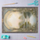 1 of 2 IMAGES THAT COORDINATE, ONE WITH CASTLE 4B, ONE WITHOUT 4A. Vintage Victorian Art Nouveau scrollwork, arched golden design is paired with a the lake in front of the castle (on coordinating paper) with a misty, gently ethereal glow.  The border is in a muted dark dusty navy blue grey. A tranquil lake and flower garden below finishes the scene. Softly enhanced by script handwriting ephemera that is layered over the crackle textured image. MSP0119-4