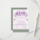An elaborately detailed Art Nouveau RSVP featuring a pattern of lilac lovebirds and lavender butterflies in profile perched atop scrolling vines of purple thistle on a light green and cream dotted background. A pairing of elegant fonts has been carefully selected to accompany this invitation's decorative floral announcement text, however, they can be changed to meet your needs. You can also change their wording and colors, as well as the color of the RSVP text, and hide any unnecessary choices in the editing panel.