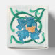 This is an image of an old vintage Art Nouveau tiles with a blue flower with a yellow centre, a green stem and leaves on a white background.