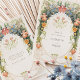 Celebrate your union with a flourish of nature and art with our Art Nouveau Inspired Floral Symphony Wedding Invitation. The front of this invitation features a lush and symmetrical arrangement of blooming flowers in a rich array of pastel colours, including coral tulips, sky-blue bellflowers, peach blossoms, and daffodil yellows, all intricately intertwined with verdant green leaves. The back of the card presents these floral motifs cascading around the edges, framing the wedding details elegantly. This design draws inspiration from the Art Nouveau movement, renowned for its stylised natural forms, flowing curves, and soft, muted colours. Crafted for couples who wish to infuse their special day with the beauty of nature and the classic sophistication of early 20th-century art.