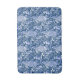 Art nouveau pattern bath mat based on a vintage William Morris tapestry inspired fabric depicting a forest scene with peacocks, hares and foxes, digitally rendered in indigo / navy blue and white