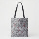 Tote bag in an Art Nouveau pattern of strawberry plants, with leaves, flowers and berries, based on a vintage William Morris textile design, digitally enhanced and coloured in black and white, with a dark graphite grey /grey background, and an accent of deep red berries